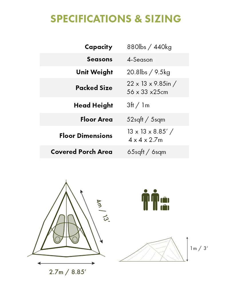 Connect nudi ultimativno iskustvo kampiranja za 2 osobe. Brz i jednostavan za postavljanje, ovaj šator za drvce za 4 sezone je čvrst, prostran i nosi masivnih 880 lbs/440 kg. Izvrstan za boravak odraslih i mladih obitelji (2 odrasle osobe i malo dijete). Ako nema drveća, može se jednostavno postaviti na tlo pomoću našeg Ground Conversion Kita.