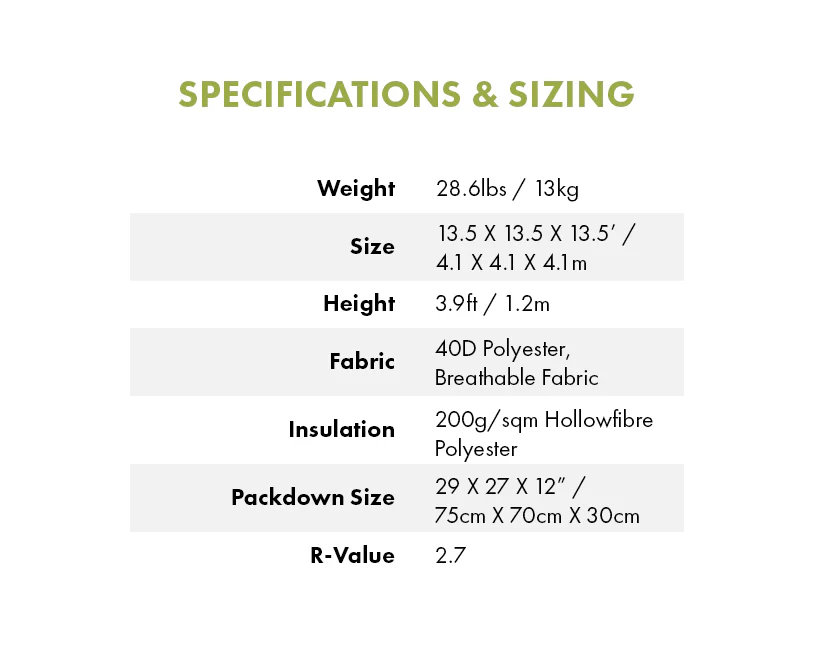Sadrži tri velika prozora s patentnim zatvaračem – po jedan sa svake strane, kao i tri manja prozora na tri ugla. Svaki prozor ima mrežasti sloj koji se ne vidi protiv insekata, što vam omogućuje namotavanje izolacijskog sloja, istovremeno osiguravajući ventilaciju i zaštitu od hladnog povjetarca i kukaca. Izolirana kabina dolazi u vlastitoj zaštitnoj vrećici za vakuumsko pakiranje za pohranjivanje kada je prostor ograničen. Također održava kabinu suhom i podalje od vlage dok se ne koristi.